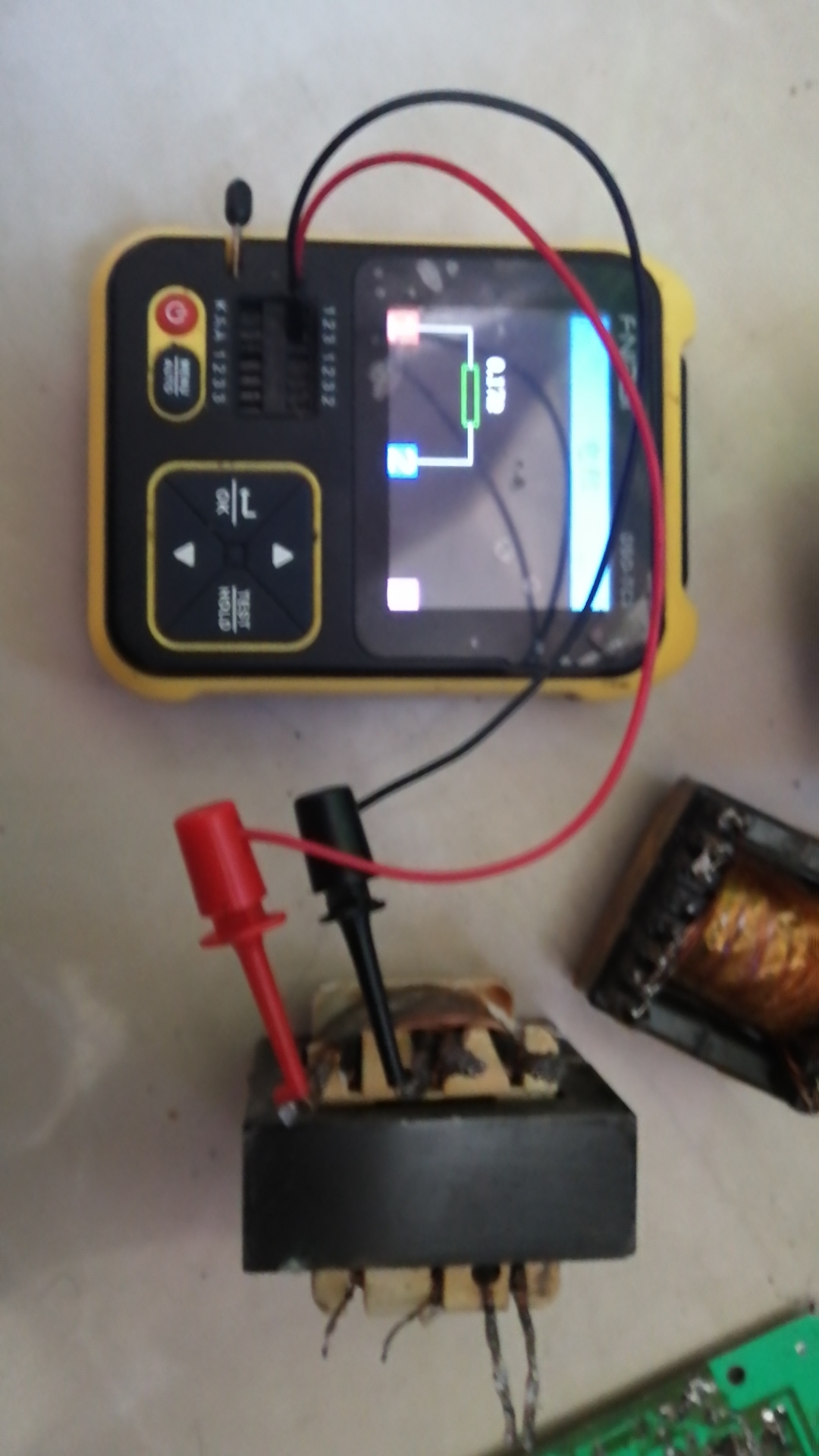 这里用一个从别的电源上面拆下的变压器作为对比。具体参数大家一看便知。总之就是电感量严重不正常。