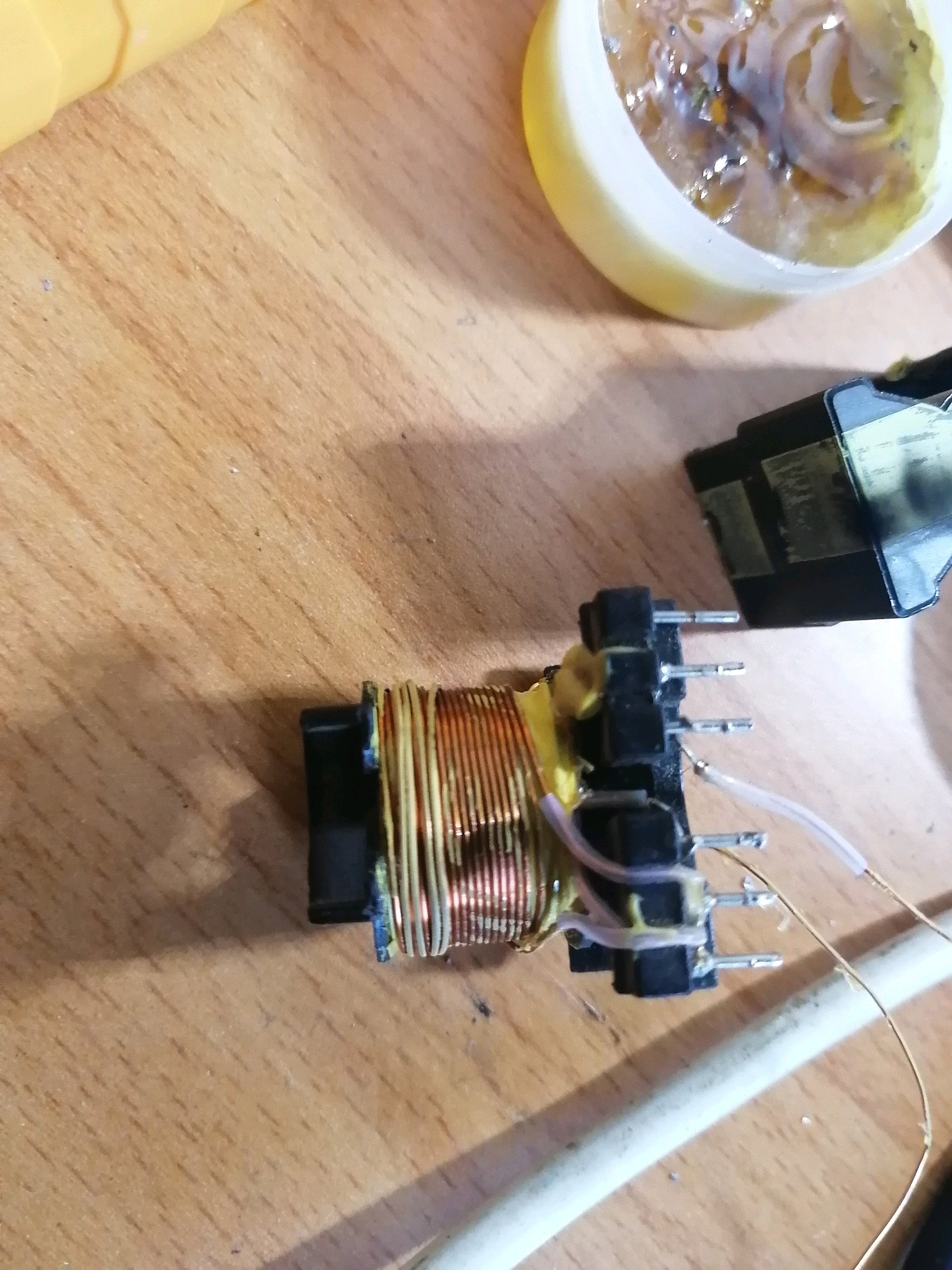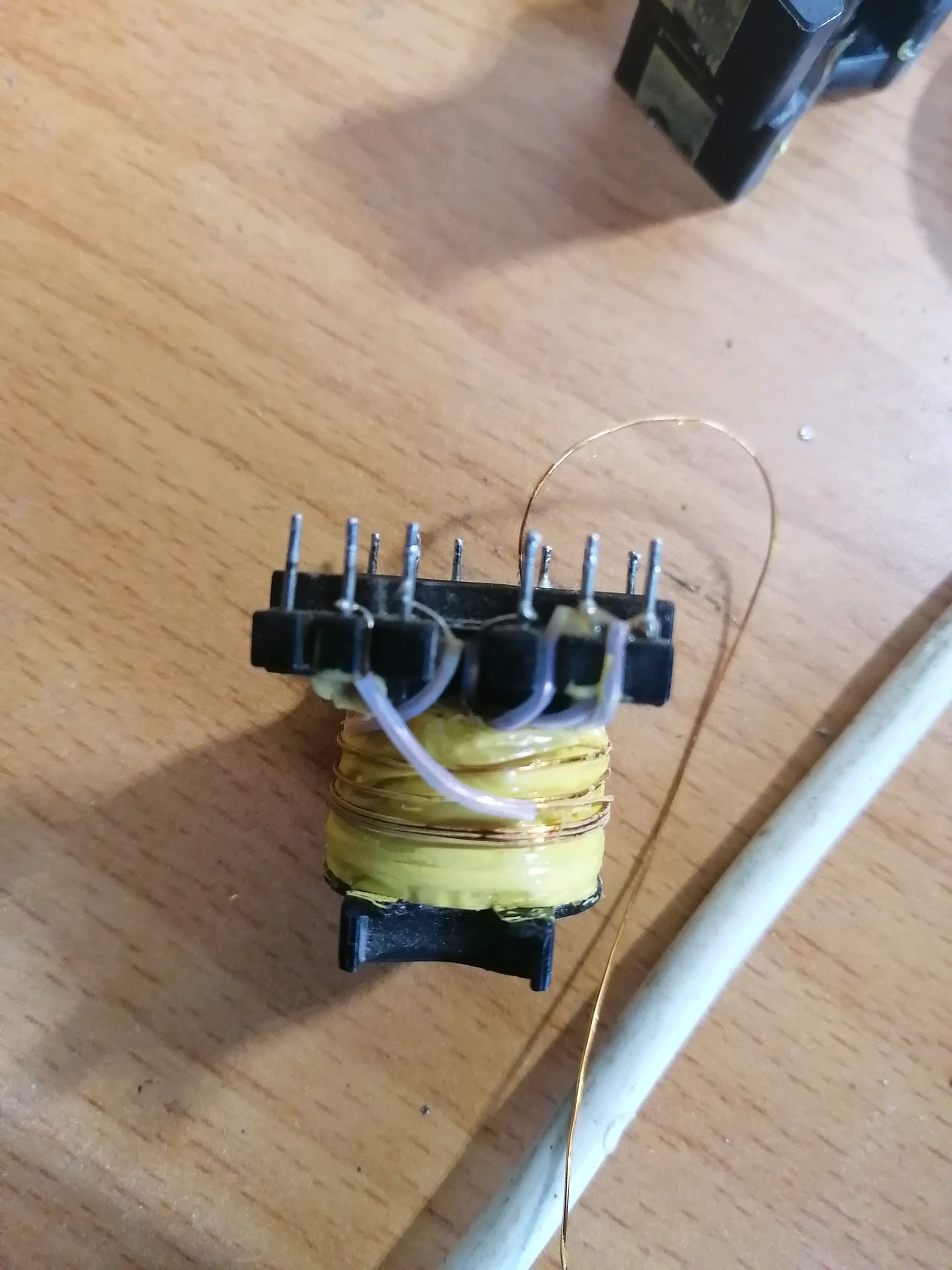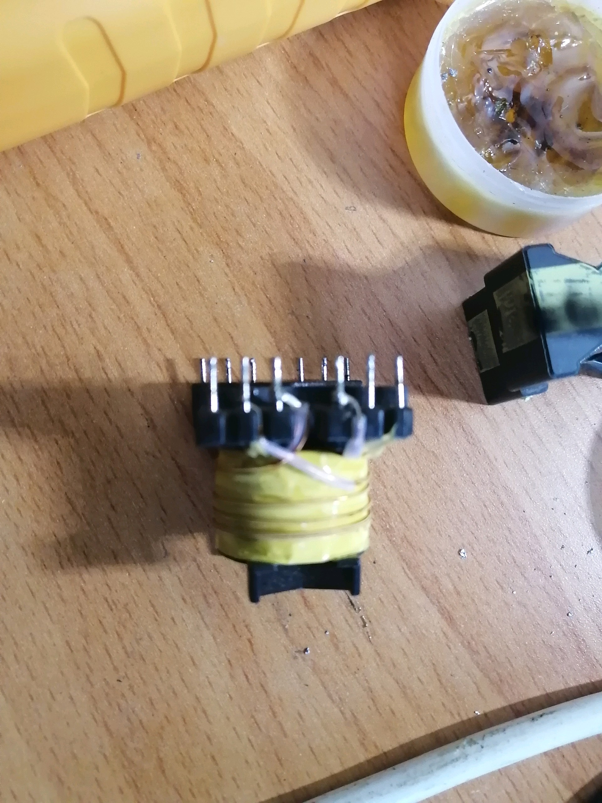 原来输出电压是48V,而我需要用20-24V的电压,虽然可以用降压模块降压,但是外挂一个电路有点占地方,而且需要额外花钱,于是我便尝试改一下输出电压,一开始只改了分压电阻,但是我发现上电后电源会打嗝。本来不想拆变压器的,这下不得不拆了。改变压器方法很简单,只是将输出绕组线径变为原来二倍,匝数改为原来二分之一,如果出现半匝则省掉那半匝线圈。然后就原来怎么拆就怎么绕,注意一定要在拆之前对每个绕组拍照,避免绕组绕反导致炸机或者无输出
